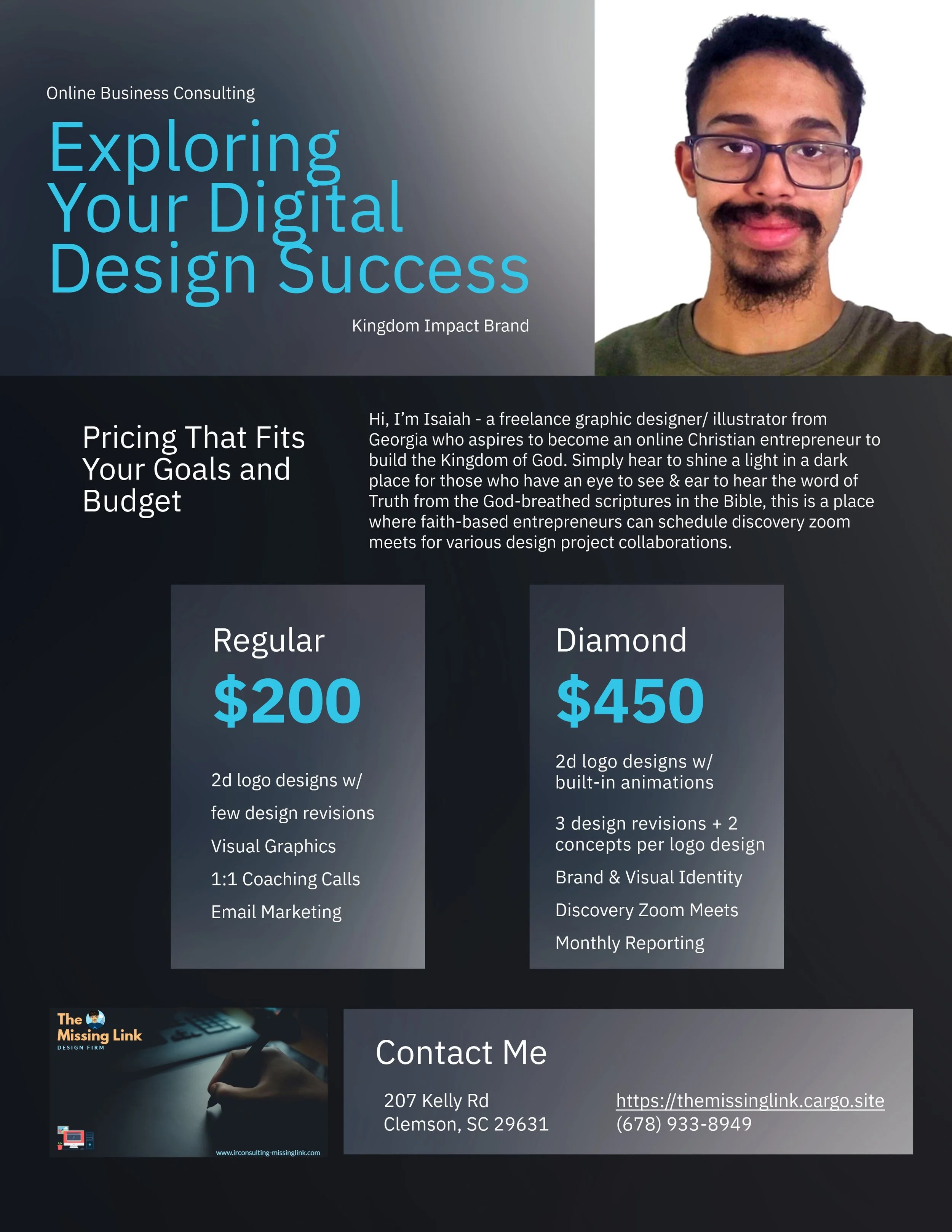 At its core, this is a Kingdom Impact Business meant to glorify God and provide purpose-driven content for entrepreneurs and fellow believers to grow in their walk with Christ. At Missing Link Studios, I am driven to leverage cutting-edge AI marketing strategies for retail/media even supporting churches, ministries, small businesses, and entrepreneurs to drive lead conversions, tips on customer retention, and lead generation offering various web + graphic design services.
